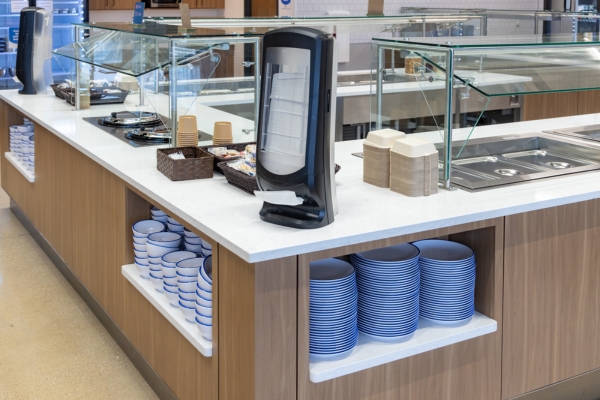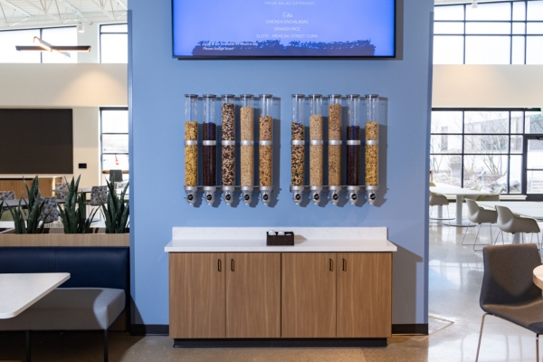 In addition to supporting the kitchen buildout, Boelter provided the essential supplies needed to fully equip Inpro’s dining operations. From plates and bowls to custom-branded trays, every detail was selected to support both functionality and brand consistency. Boelter also supplied dispenser solutions for their new nut wall area, creating a convenient self-service snack destination for their staff.